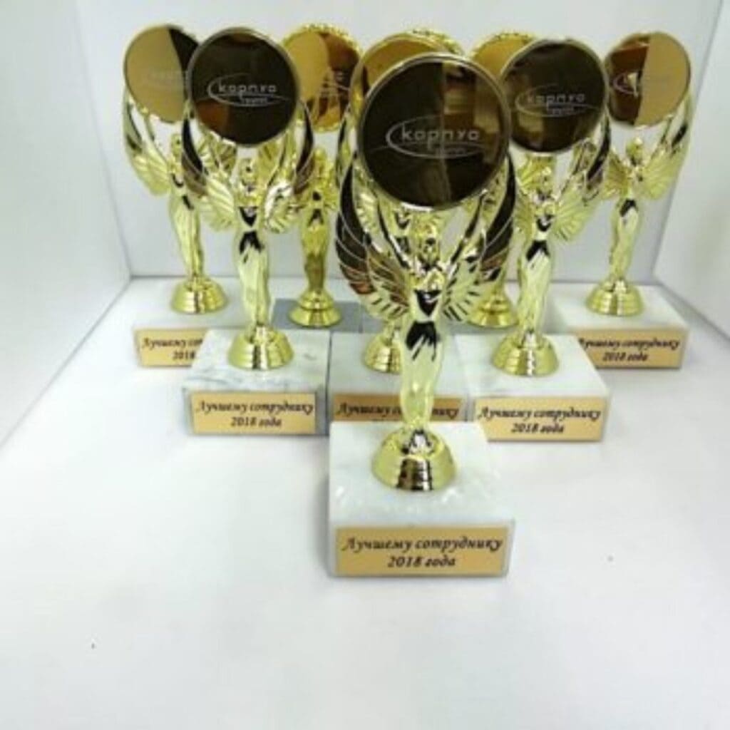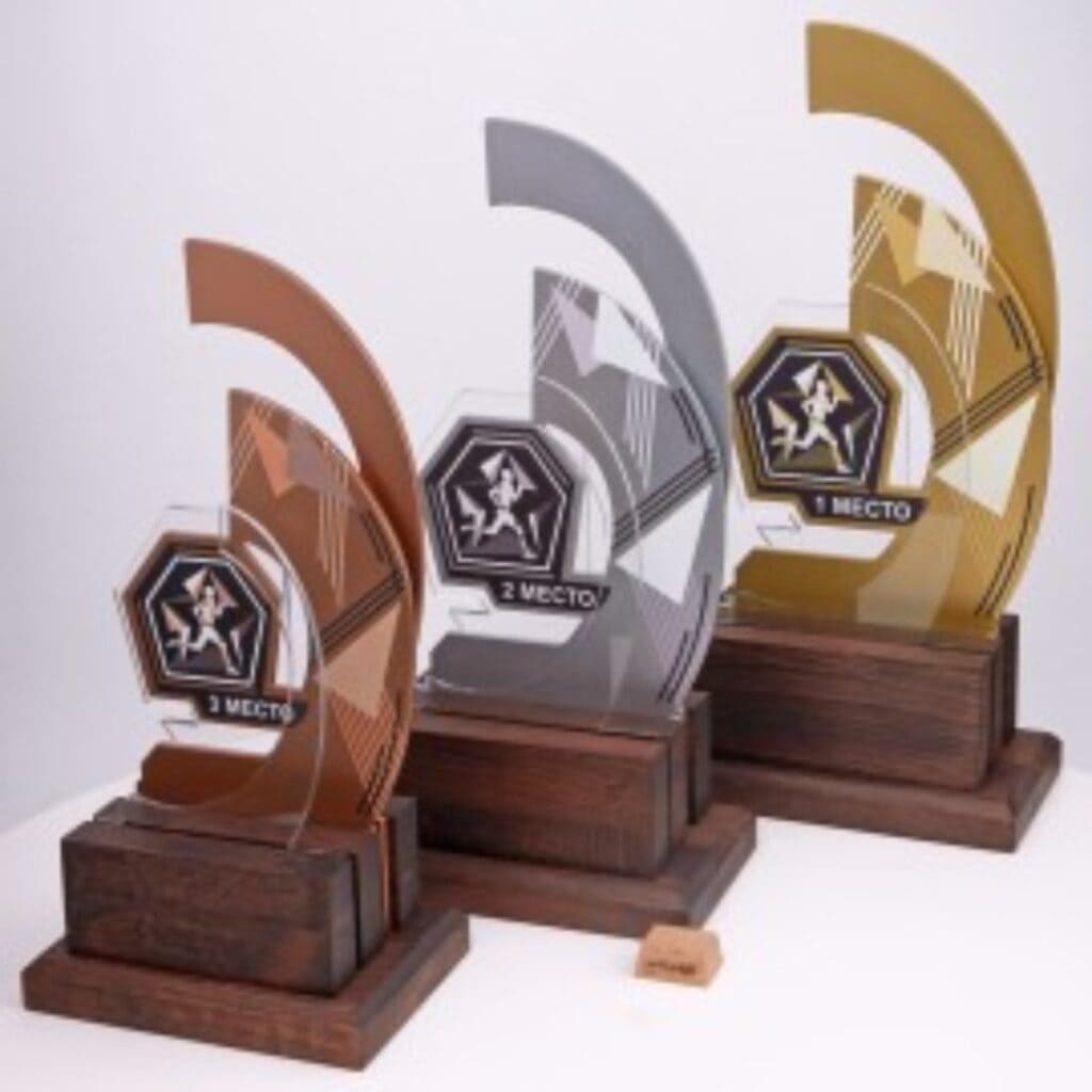- Высокое качество и внимание к деталям. Использование материалов премиум-класса, от стекла и металла до акрила, позволяет создавать долговечные и эстетически привлекательные награды.